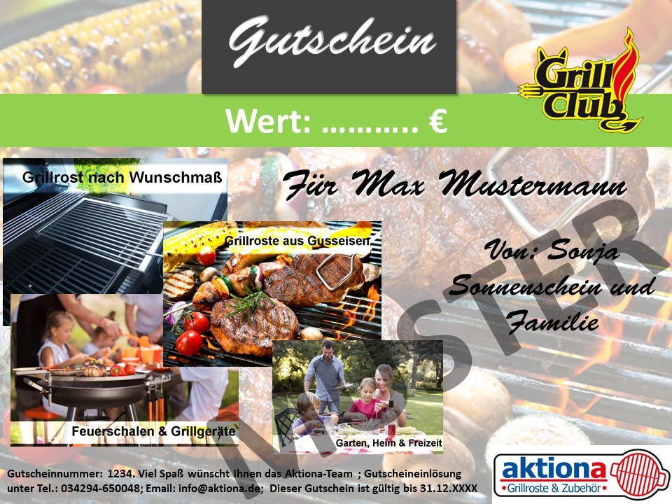 Sie sind noch auf der Suche nach einem außergewöhnlichen Geschenk? Ihr Freund/Bekannter benötigt einen neuen Grillrost? Sie kennen aber dessen Größe nicht? Guss, Edelstahl? Oder, oder, oder.... Dann verschenken Sie doch einfach einen Gutschein von www.aktiona.de und lassen Ihre Liebsten aus unserem Grill- und sonstigem Sortiment wählen.